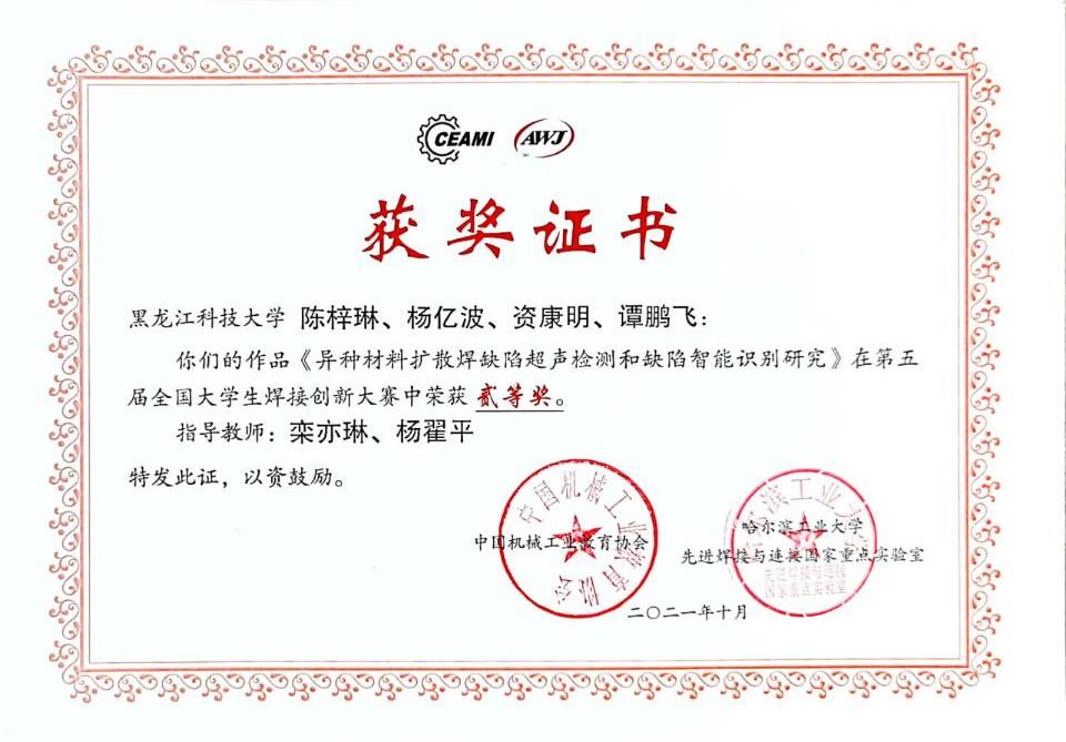 此次大赛按固定命题项目和自由选题项目两大类分别进行。公司焊接技术与工程专业教学团队从题目选择、材料准备、工艺和结构设计、创新应用等每个环节,师生共同研讨,反复试验。最终由朱艳老师带队,焊接专业本科生组成的4支队伍进入大赛决赛。经大赛初审,现场测试和答辩等环节,栾亦琳和杨翟平老师指导本科生陈梓琳、杨亿波、资康明、谭鹏飞的作品《异种材料扩散焊缺陷超声检测和缺陷智能识别研究》获得自由选题组二等奖,其它3件作品获得三等奖。